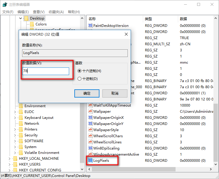 4. 找到LogPixels(如果沒有就新建一個“DWORD (32位)值”,命名為LogPixels),將LogPixels修改為所需放大的百分比數(shù)值,注意十六進制與十進制的轉(zhuǎn)換(括號內(nèi)為十進制的放大百分比,括號外為十六進制的放大數(shù)值,例如想放大到120%,就填寫78):78(120%),7D(125%),96(150%),C8(200%),如下圖——