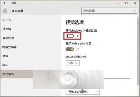 步驟很簡單,打開“設置”,然后選擇“輕松使用”,在“其他選項”有一個名為“視覺選項”的設置,將其中“在 Windows 中播放動畫”這一項關閉即可。