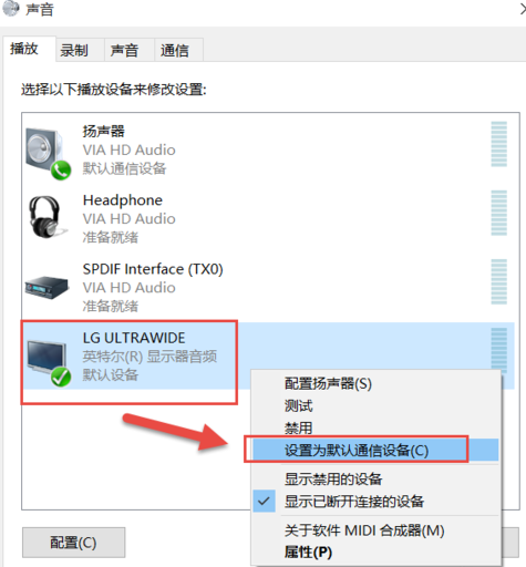 2、選擇外接顯示器的音箱設(shè)置,點(diǎn)擊右鍵選擇“設(shè)置為默認(rèn)通信設(shè)備”即可。
