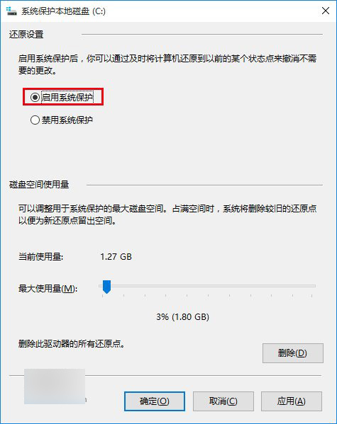 3、在彈出的設置窗口中點擊“啟用系統保護”,然后點擊“確定”(若要關閉系統還原功能,點擊“禁用系統保護”后“確定”)