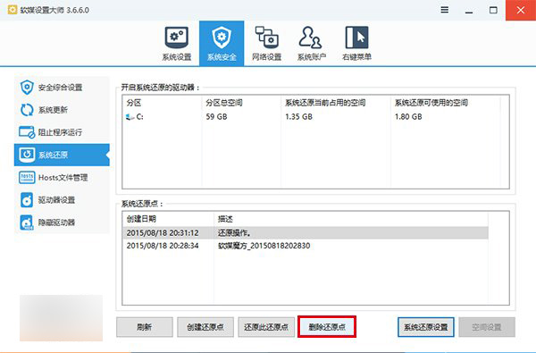 很多用戶習慣于關閉系統還原功能,是怕占用過多硬盤空間。在上圖中可以看到,系統還原點占據的磁盤空間容量可以根據自己意愿調節,過期、多余的還原點會自動被新還原點替換。當然,你也可以在“設置大師”中手動刪除一些你認為沒用的還原點