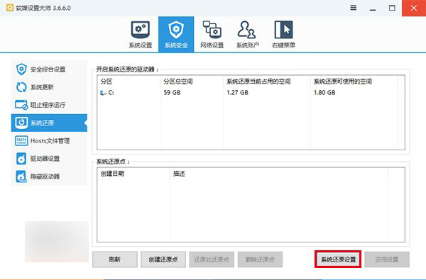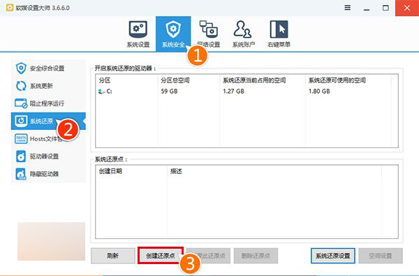 3、進入“設置大師”的“系統還原”界面后,點擊“創建還原點”就可以開始系統還原點的創建過程,首先會出現以下提示: