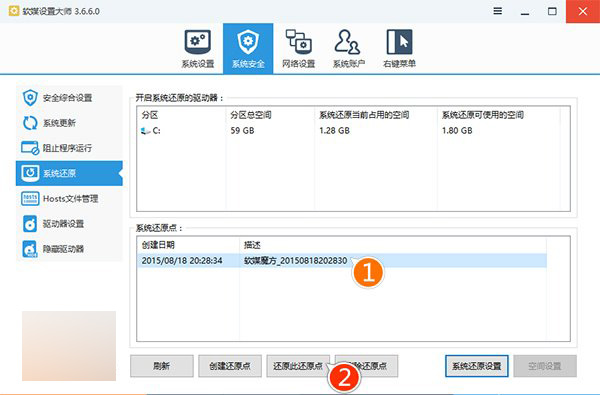1、打開軟媒魔方后,進入“設置大師”的“系統還原”界面(方法參見第一部分第2步)
