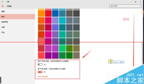 4、更多的顏色設置,可滾動界面,按照個人喜好調整。個人建議將“開始菜單、任務欄和操作中心透明”勾選上。這樣看起來更美觀。