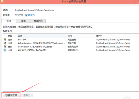 在hosts的高級(jí)安全設(shè)置界面點(diǎn)擊更改權(quán)限,如下圖所示。