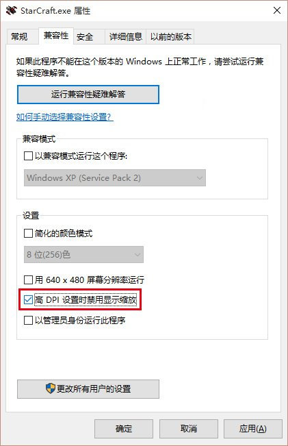 方法:進(jìn)入《星際爭(zhēng)霸》游戲文件夾根目錄,找到StarCraft.exe(或Brood.exe)文件,單擊右鍵進(jìn)入“屬性”,然后選擇“兼容性”選項(xiàng)卡,勾選“高DPI設(shè)置是禁用顯示縮放”,然后點(diǎn)擊“確定”即可。