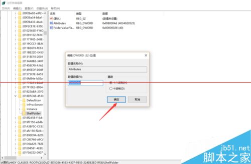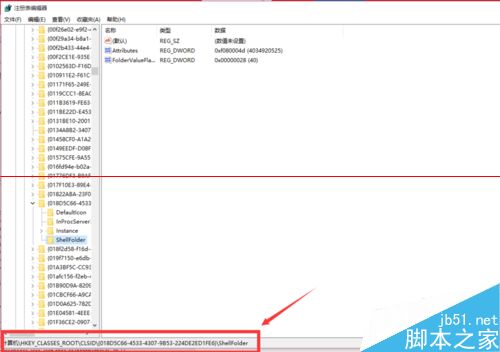 4、進入注冊表之后,我們需要在如圖示目錄下,找到“ShellFolder”,如圖示。具體路徑為:HKEY_CLASSES_ROOTCLSID{018D5C66-4533-4307-9B53-224DE2ED1FE6}ShellFolder。