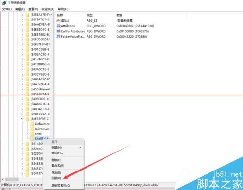 9、右鍵點擊”ShellFolder”,然后選擇”權限“,如圖示。