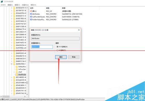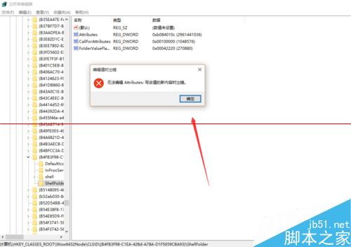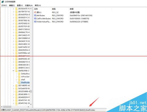 6、之后,我們再進入箭頭所示的目錄下,找到“ShellFolder”,具體路徑:HKEY_CLASSES_ROOTWow6432NodeCLSID{B4FB3F98-C1EA-428d-A78A-D1F5659CBA93}ShellFolder。