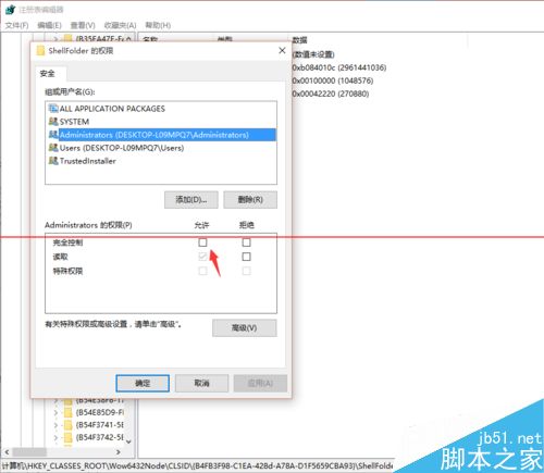14、點擊確定之后,再點擊應用,之后我們回到ShellFolder的權限,然后我們勾選”完全控制“如圖示。