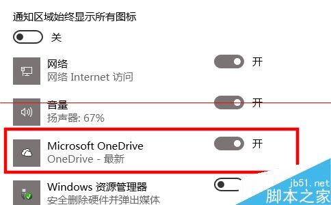 5、把OneDrive的滑塊打開,OneDrive圖標就會顯示在任務欄上了(相反的操作可以隱藏圖標)