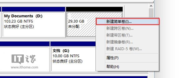 ▲ 在未分配空間上右鍵單擊,選擇“新建簡單卷”,在出現的窗口中一路點擊“下一步”即可。注意,如果提示你需要將硬盤轉換為動態磁盤,那是因為你的硬盤是MBR分區結構,主分區數量已經超過了該分區類型的最大限制——4個,此時請放棄分區操作,重新選擇一個可用的分區來放置安裝文件。