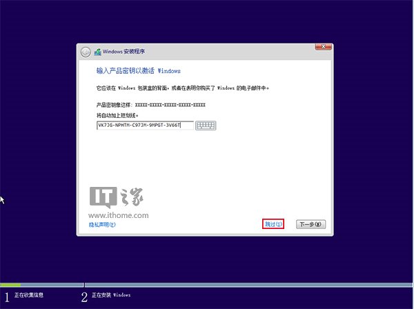 ▲此處可用安裝密鑰VK7JG-NPHTM-C97JM-9MPGT-3V66T(只用于專業版安裝,激活無效),輸入后點擊“下一步”繼續;也可以點擊“跳過”,在安裝完成后輸入激活密鑰