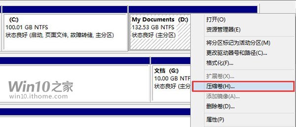 ▲打開磁盤管理(按Win+X),找一個剩余空間較大的分區,右鍵單擊選擇“壓縮卷”