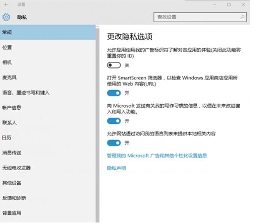 如果你已經安裝了Windows 10而沒有進行上面的設置,那么你還可以選擇在設置頁面的隱私選項中進行設置。