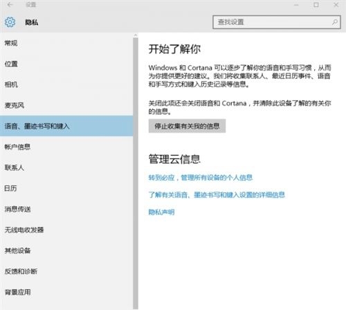 進入“語音、墨跡書寫和鍵入”選項,然后點擊“停止收集有關我的信息”,這樣就能關閉Cortana和語音聽寫功能。