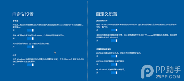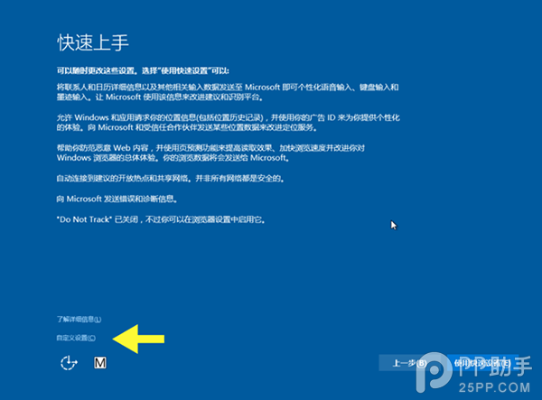 Windows10 安裝的最后階段會提示用戶進行快速設置,這個地方最好不要選擇「使用快速設置」,而是通過「自定義設置」關閉不必要的一些選擇。