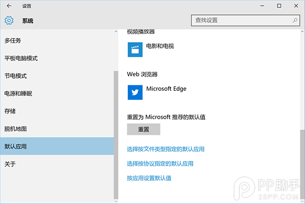 Windows10 的瀏覽器變成了 Microsoft Edge,從界面風格上能直觀的看到的幾個變化就是增加了Web 筆記、閱讀列表和共享功能。原來的 IE 也還在,可以通過菜單選擇「使用 Internet Explorer 打開」,或者直接在「設置 – 默認應用」中修改默認的 Web 瀏覽器。