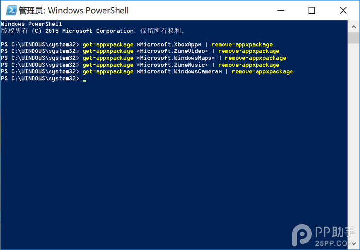 作為虛擬機的使用環(huán)境來說 Windows10 的很多內(nèi)置應用可以選擇卸載,例如:Xbox、Movies、Maps、Groove、Camera等等。在所有應用中找到 PowerShell 并以管理員權(quán)限運行,輸入類似get-appxpackage Microsoft.WindowsCamera | remove-appxpackage的命令行完成卸載。