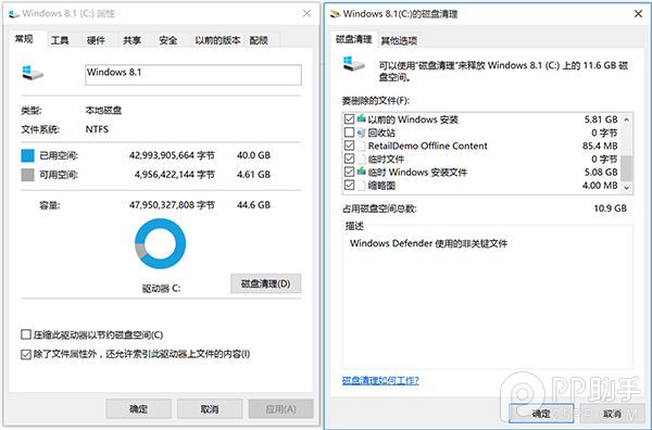 升級到 Windows10 后原來的舊版本的系統(tǒng)還在、另外安裝后也留下了不少殘留文件,這些可以通過磁盤清理刪除掉以節(jié)省大量的磁盤空間(資源管理器選擇磁盤,磁盤上右鍵 – 屬性 – 磁盤清理)。