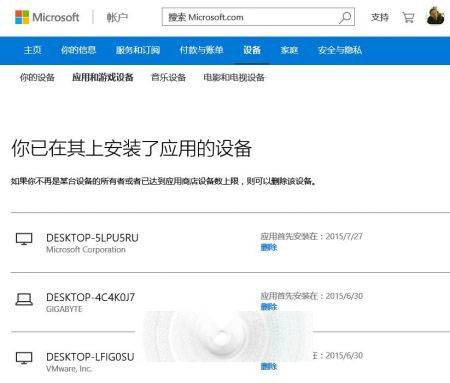然后登陸Web版微軟賬戶的Win10設備,默認顯示用戶已安裝應用的所有Win10 PC/手機/平板,Win10虛擬機和模擬器等設備。