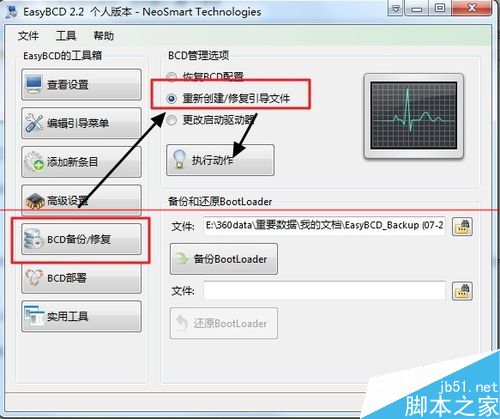 2、 運行軟件,選擇:BCD備份/修復 —— 選擇:重新創建/修復引導文件 —— 執行動作