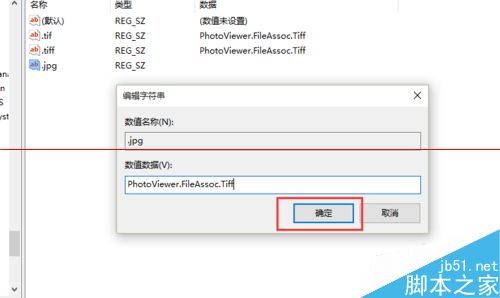 5、接下來就是比較關(guān)鍵的步驟了,如果你想要打開.jpg后綴的文件,那么數(shù)值名稱要寫為.jpg,數(shù)值數(shù)據(jù)寫為“PhotoViewer.FileAssoc.Tiff”,如下圖所示,然后點擊“確定”按鈕。