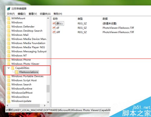 3、在Microsoft目錄下,我們需要找到Windows Photo ViewerCapabilitiesFileAssociations目錄項,直到看到該子目錄下的一系列關(guān)鍵文件。