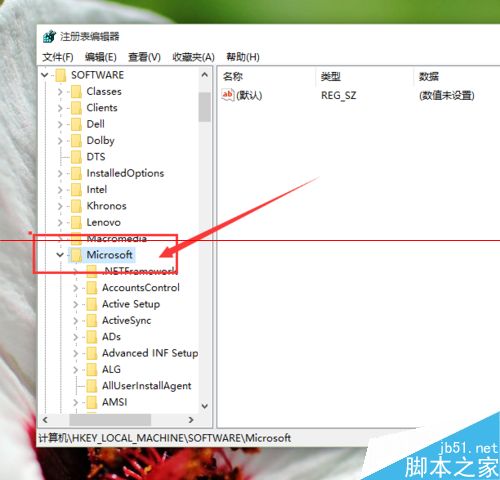2、打開注冊表編輯器之后,我們雙擊左側(cè)的目錄,依次打開HKEY_LOCAL_MACHINESOFTWAREMicrosoft目錄,如下圖所示。