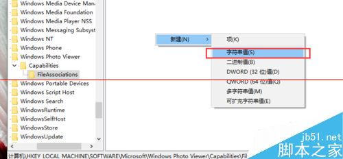 4、在FileAssociations目錄下,我們對著該界面擊右鍵,選擇“新建-字符串值”菜單,如下圖所示。