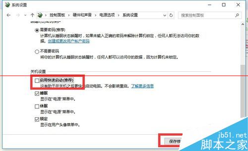 4、接下來從此界面的最下方“關機設置”欄目中,清除勾選“啟用快速啟動(推薦)”項,點擊“保存修改”按鈕完成設置。