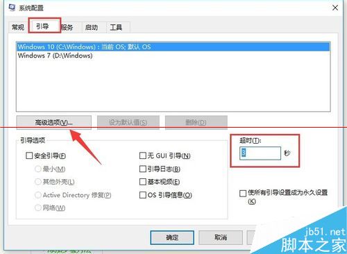 4、切換到“引導”選項卡,將“超時”設置為“3”秒,同時點擊“高級選項”按鈕。