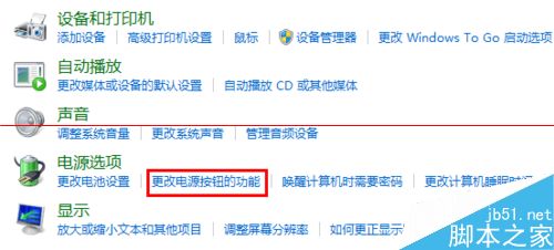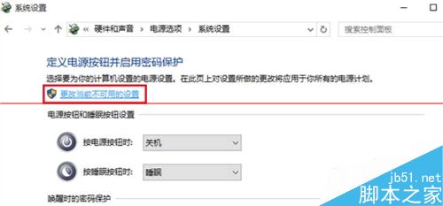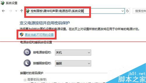 3、從打開的“控制面板”界面中,依次進入“硬件和聲音”-“更改電源按鈕的功能”界面,點擊“更改當前不可用的設置”按鈕。