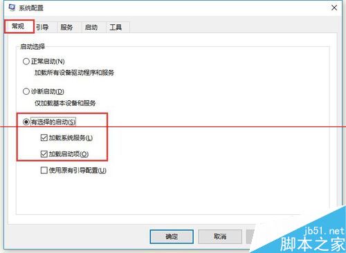 3、在“系統配置”窗口中,切換到“常規”選項卡,勾選“有選擇的啟動”項,同時勾選“加載系統服務”和“加載啟動項”。