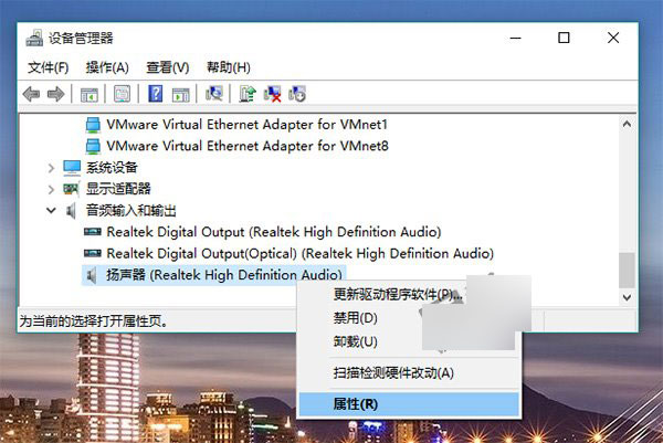 ▲ 找到“聲音輸入和輸出”,右鍵單擊默認聲音輸出設備,選擇屬性。