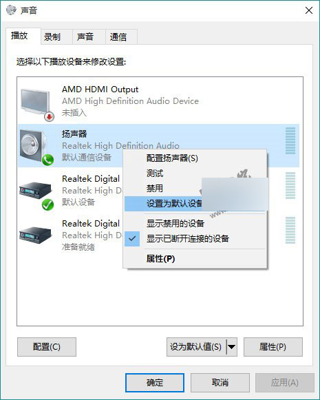 ▲選擇合適的設備作為默認通信設備(此處作為演示,演示設備未使用VIA聲卡)