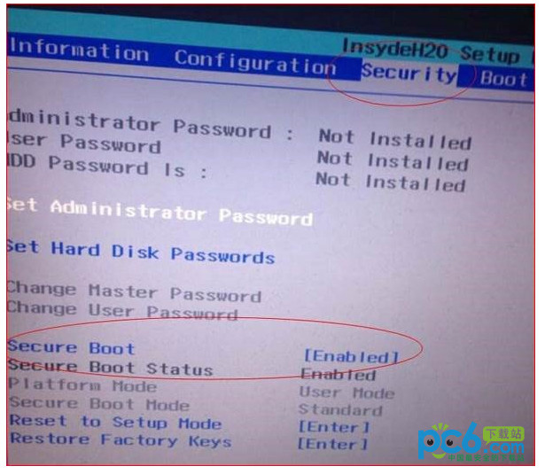 按鍵盤上下左右鍵選擇各個導航夾,一般在“Security”導航夾內可以找到SecureBoot選項,如下圖所示。