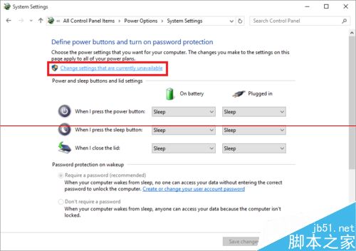 6、選擇“更改當(dāng)前不可用的設(shè)置”,勾選下方的“休眠”