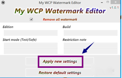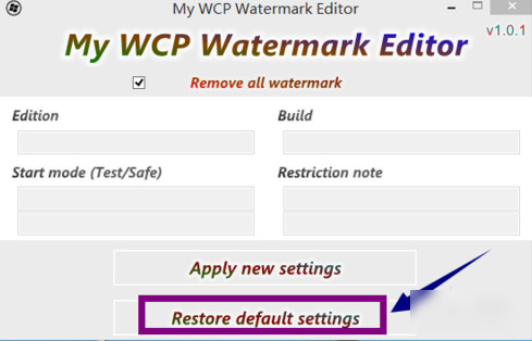 等待程序處理,此時桌面變藍持續大概一分鐘后正常注意,去除水印后,系統屬性中系統版本名字將無法顯示。如果要恢復水印,只需點擊“Restore default settings”即可。