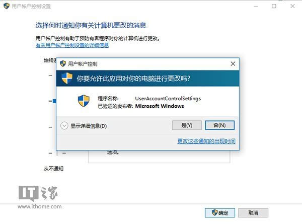 ▲在控制面板(Win32程序)將UAC通知級別調高,授權提示正常顯示