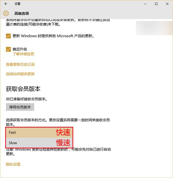 4、點擊下拉菜單選擇Win10 Insider會員版本更新通道。一般來說,“快速版”推送較頻繁,容易更快見到Win10新功能,而“慢速版”推送頻率比較低,但更穩定。這兩個版本只有上述區別,與“激活”等條件無關。