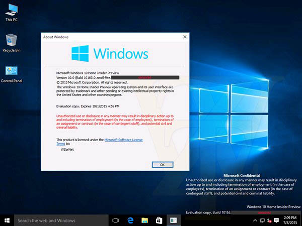 Win10預覽版10163承接此前推送的10162,看起來并沒有明顯的變化,因此微軟更看重Bug修復和性能提升。而且俄羅斯爆料大神WZor本次展示的版本是Win10 Insider家庭預覽版。