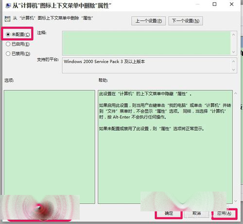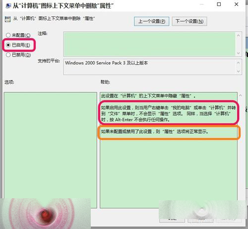 6、在打開(kāi)的從“計(jì)算機(jī)”圖標(biāo)上下文菜單中刪除“屬性”窗口,幫助一欄中顯示:如果啟用此設(shè)置,則當(dāng)用戶(hù)右鍵單擊“我的電腦”或“計(jì)算機(jī)”并轉(zhuǎn)到文件菜單時(shí),不會(huì)顯示“屬性”選項(xiàng)。同樣當(dāng)選擇“計(jì)算機(jī)”時(shí),按Ctrl+Enter不會(huì)執(zhí)行任何操作。