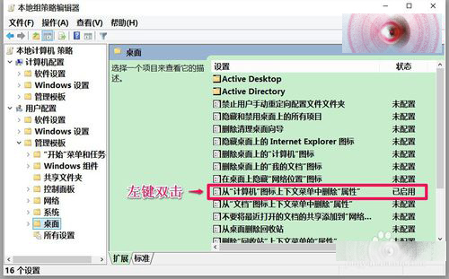 5、在桌面對(duì)應(yīng)的右側(cè)窗口,我們找到:從“計(jì)算機(jī)”圖標(biāo)上下文菜單中刪除“屬性”,并可以看到,該項(xiàng)的狀態(tài)為:已啟用,左鍵雙擊:從“計(jì)算機(jī)”圖標(biāo)上下文菜單中刪除“屬性”;