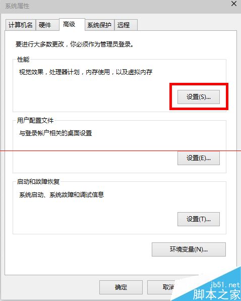 5、我們回到“系統屬性”窗口,我們點擊“性能”下“設置”,在“性能選項窗口”我們點擊“高級——更改”