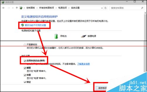 4、點擊“選擇電源按鈕的功能”后悔彈出“系統設置窗口”,在這個窗口里 我們先點擊“更改當前不可用的設置”,然后我們勾選“啟用快速啟動”,最后我們“保存修改”