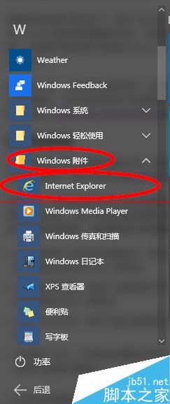 2、在所有應用列表中選擇“windows附件”,IE瀏覽器就在這個列表中