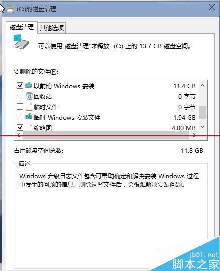 6、系統(tǒng)會(huì)再次計(jì)算空間,這次就會(huì)計(jì)算老的系統(tǒng)文件了,選中<以前安裝的windows>復(fù)選框,有11G,如果想再清理,可以把<臨時(shí)的windows安裝文件>也選中,也有接近2G,然后點(diǎn)擊確定。