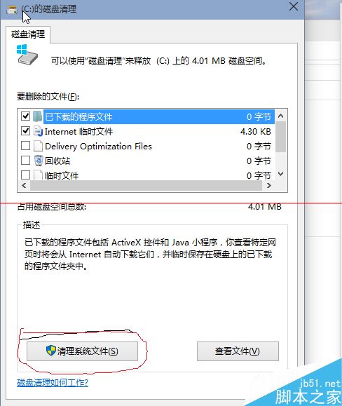 5、系統(tǒng)會(huì)自動(dòng)掃描并收集可以清除的空間,但系統(tǒng)缺省不會(huì)清除系統(tǒng)文件,需要在彈出菜單中選擇<清理系統(tǒng)文件>,如下圖紅圈所示