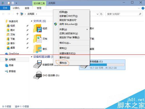 3、在我的電腦中,右鍵點(diǎn)擊該目錄所在盤符,如小編是在C盤,在彈出菜單中選擇最下一行<屬性>